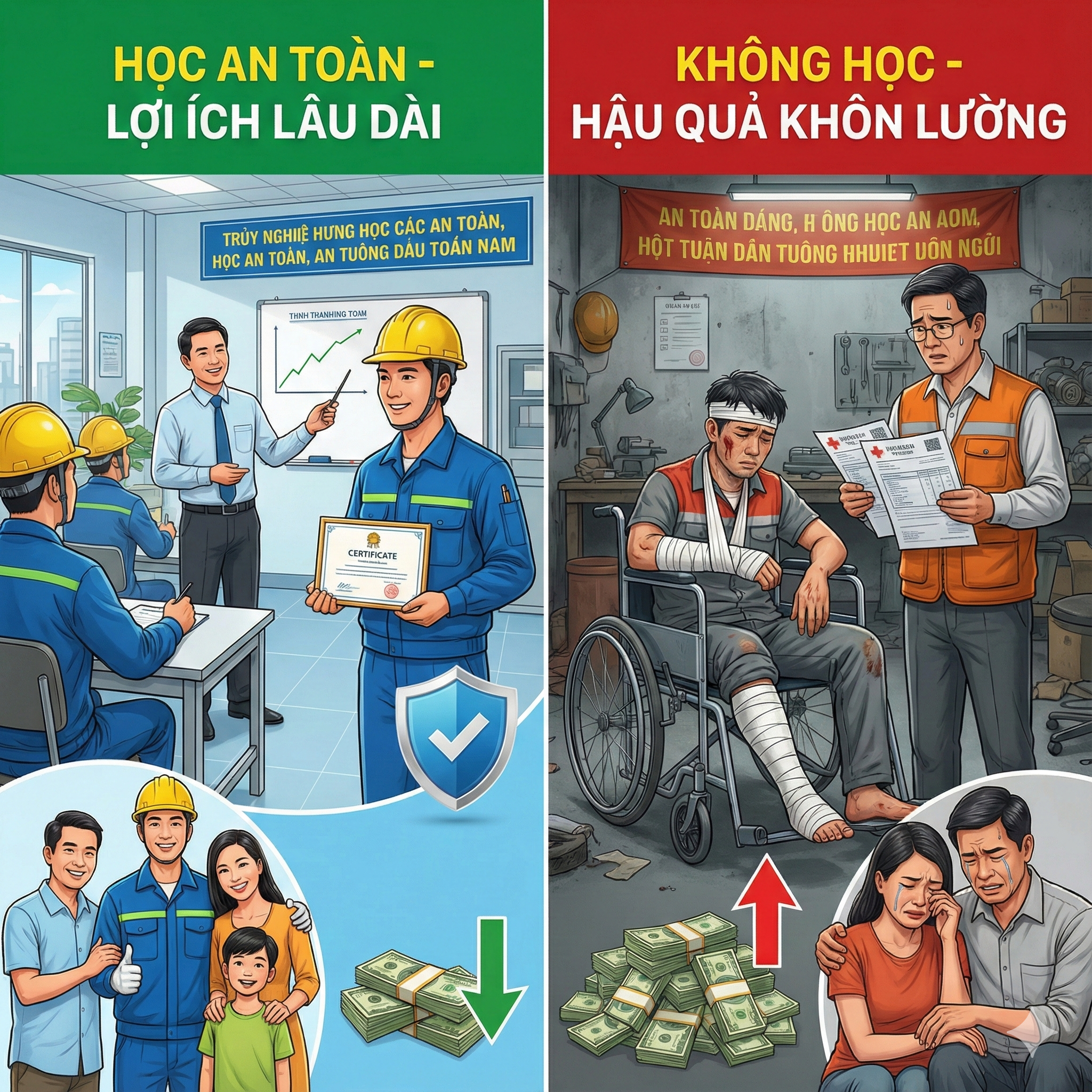 • Thiệt hại tài chính: Chi phí bồi thường tai nạn, chi phí y tế, sửa chữa máy móc hỏng hóc thường cao gấp hàng chục lần chi phí mở một lớp học an toàn.