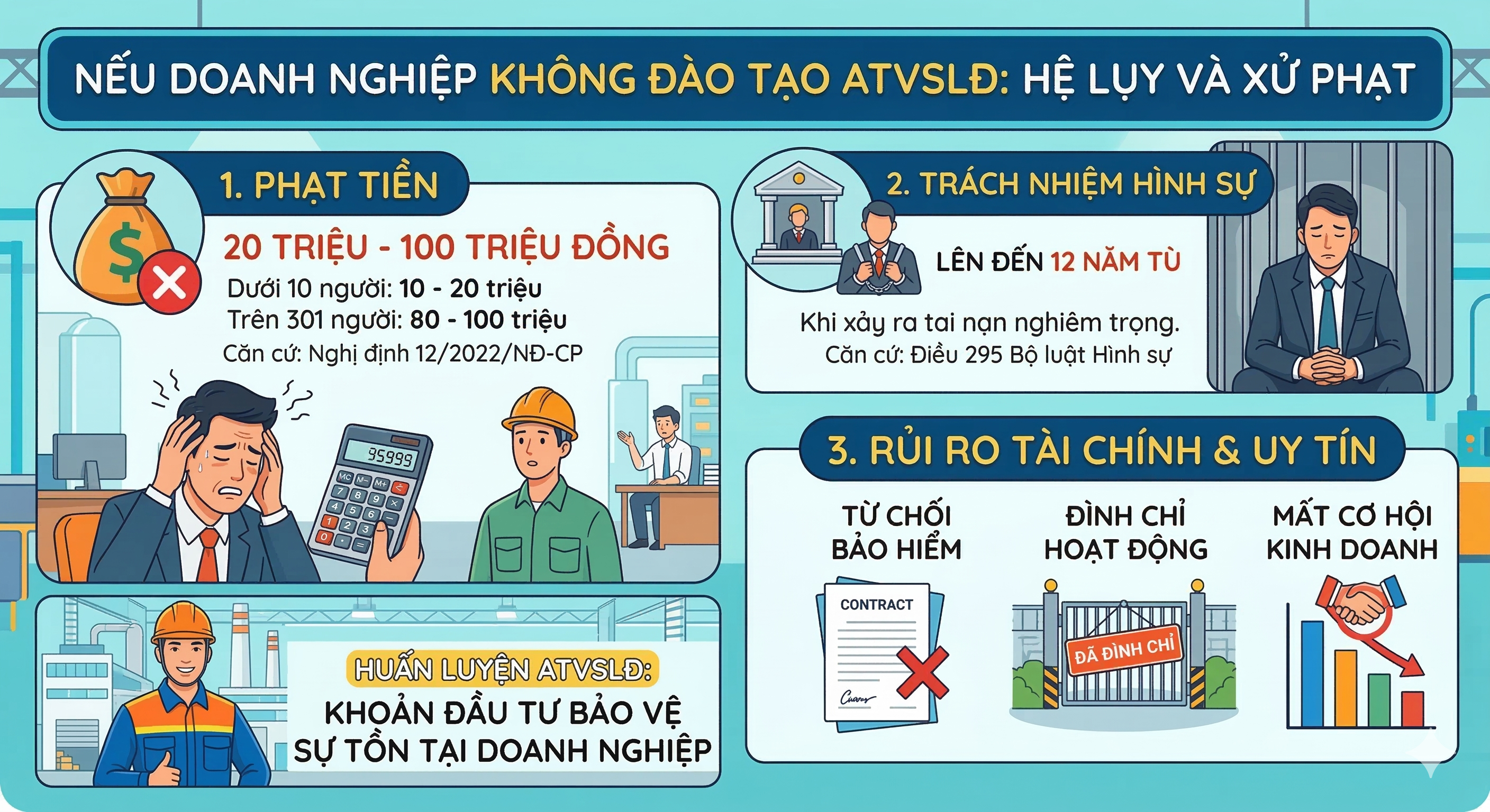 Nếu doanh nghiệp không đào tạo an toàn mà để xảy ra tai nạn lao động nghiêm trọng (gây thương tích trên 61% hoặc tử vong), người đứng đầu có thể bị truy cứu trách nhiệm hình sự về tội “Vi phạm quy định về an toàn lao động” theo Điều 295 Bộ luật Hình sự 2015 (sửa đổi 2017). Hình phạt có thể lên đến 12 năm tù.