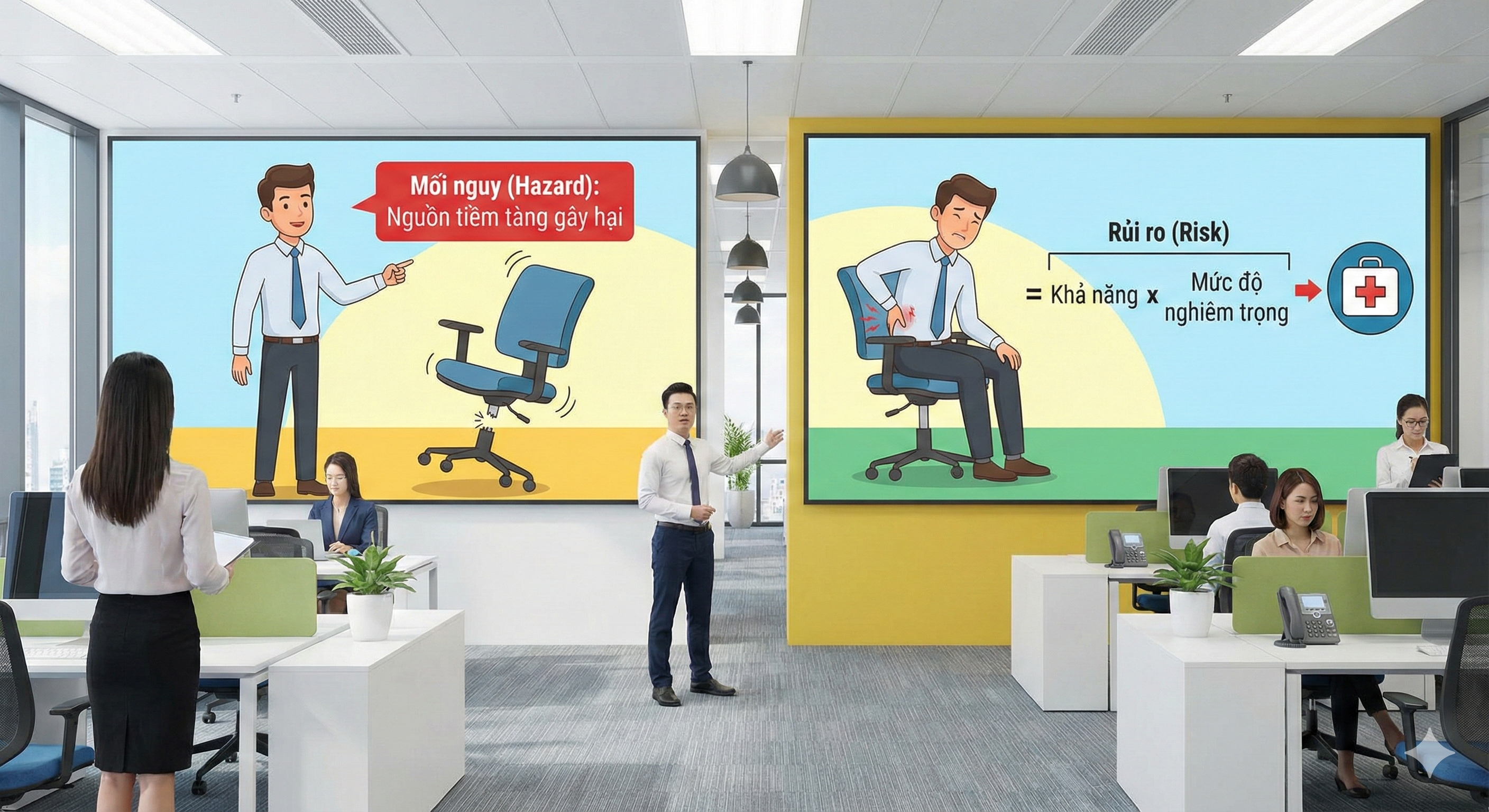 Chúng ta xác định “chiếc ghế hỏng” là Mối nguy, từ đó đưa ra biện pháp kiểm soát là thay thế ghế Ergonomics hoặc tập huấn tư thế ngồi đúng. Hành động này nhằm mục đích giảm thiểu “Rủi ro” mắc bệnh nghề nghiệp cho nhân viên.