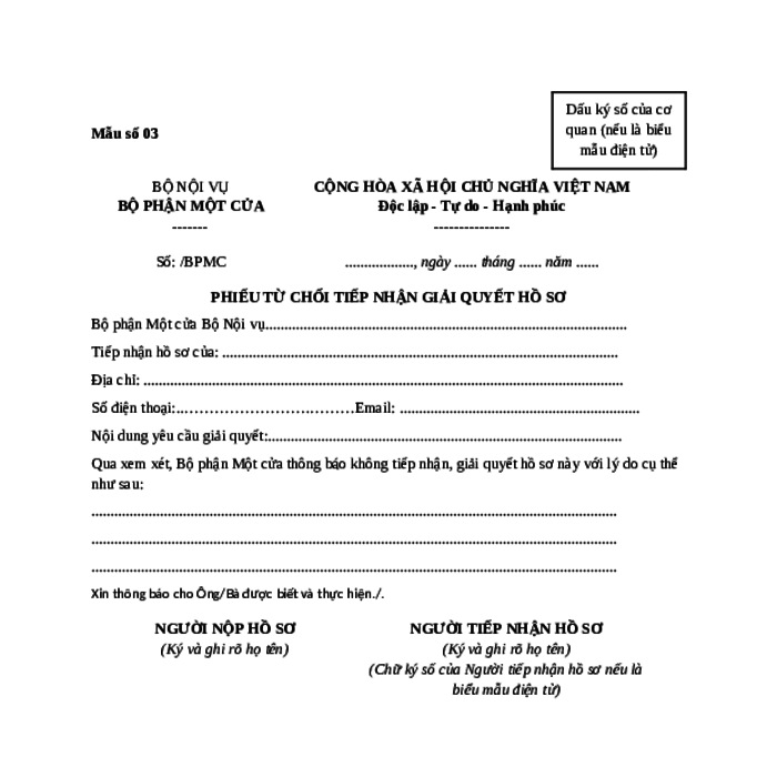 Nếu hồ sơ không thuộc thẩm quyền giải quyết hoặc không đủ điều kiện pháp lý để tiếp nhận, cán bộ sẽ lập Phiếu từ chối tiếp nhận giải quyết hồ sơ. Bạn sẽ nhận bản cứng (bản giấy) trực tiếp tại quầy giao dịch, có chữ ký của cán bộ và đóng dấu của cơ quan tiếp nhận.