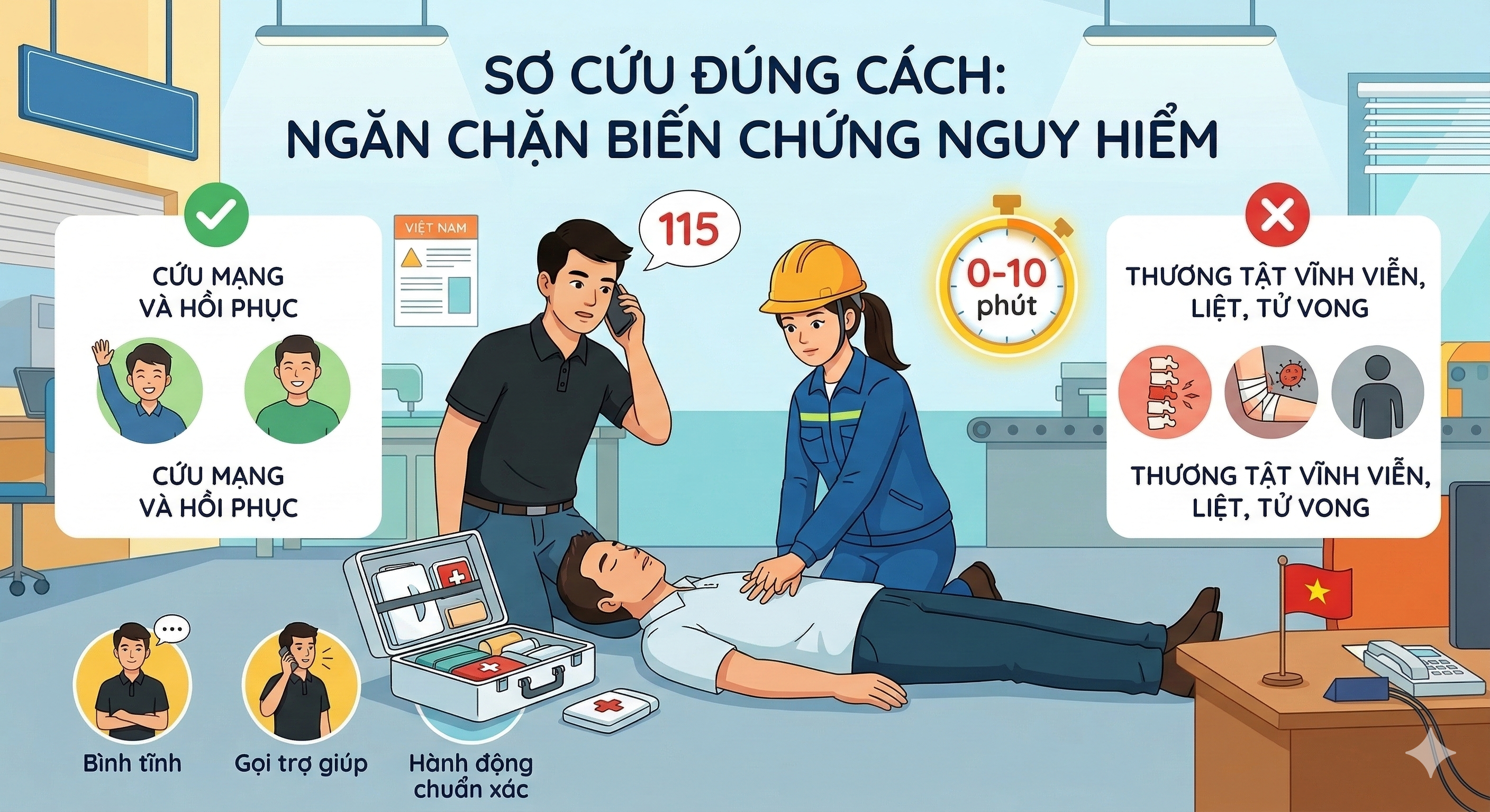 Sơ cứu đúng cách không chỉ là một quy định trong luật ATVSLĐ mà còn là trách nhiệm đạo đức giữa đồng nghiệp với nhau. Một hành động chuẩn xác trong phút chốc có thể cứu cả một đời người.