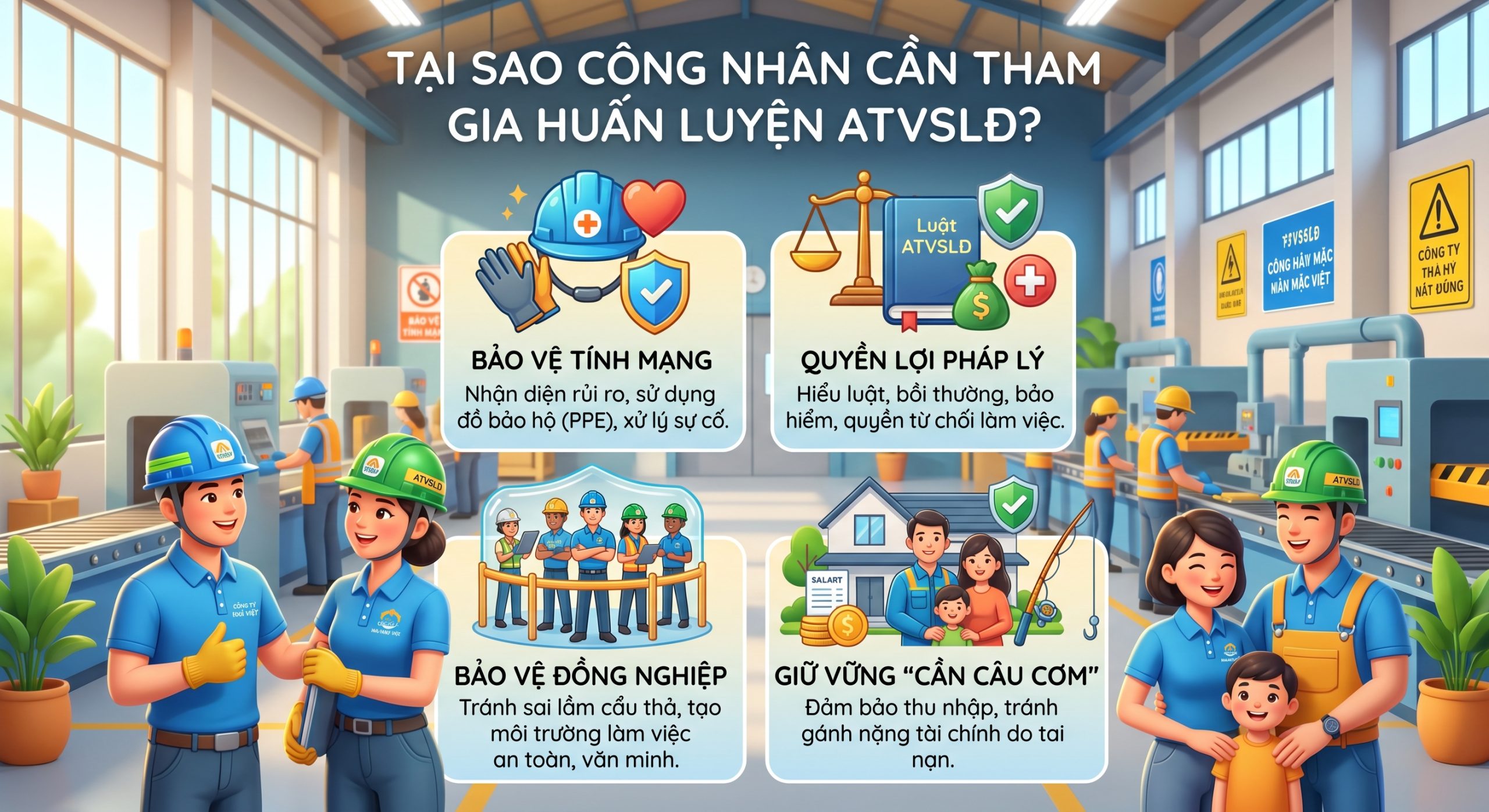 Kết luận Tham gia các buổi huấn luyện ATVSLĐ hoàn toàn không phải là thủ tục chống đối, mà là quyền lợi thiết thực nhất để bảo vệ sinh mạng và tương lai của chính bạn. Hãy trân trọng và tập trung trong mỗi giờ học an toàn, để mỗi ngày đi làm đều được trở về nhà lành lặn và bình an.